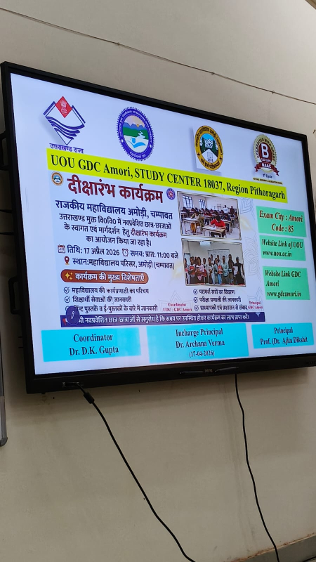 अमोड़ी महाविद्यालय में यूओयू छात्रों के लिए दीक्षारंभ कार्यक्रम सम्पन्न राजकीय महाविद्यालय अमोड़ी, चम्पावत (क्षेत्र पिथौरागढ़ के अन्तर्गत अध्ययन केंद्र 18037, परीक्षा केंद्र 85, अमोड़ी) में दिनांक 17 अप्रैल 2026 को उत्तराखण्ड मुक्त विश्वविद्यालय के नवप्रवेशित छात्र-छात्राओं के स्वागत एवं मार्गदर्शन हेतु दीक्षारंभ कार्यक्रम का सफलतापूर्वक आयोजन किया गया। कार्यक्रम का आयोजन प्रातः 11:00 बजे महाविद्यालय परिसर में संपन्न हुआ, जिसमें यूओयू में नवप्रवेशित विद्यार्थियों के साथ-साथ महाविद्यालय के प्राध्यापकों एवं कर्मचारियों ने सक्रिय रूप से प्रतिभाग किया। कार्यक्रम का संचालन समन्वयक डॉ. डी. के. गुप्ता द्वारा किया गया। कार्यक्रम के दौरान विद्यार्थियों को महाविद्यालय का परिचय, महाविद्यालय एवं यूओयू की वेबसाइट, प्रशासनिक व्यवस्था तथा विषयवार प्राध्यापकों से अवगत कराया गया। इस अवसर पर डॉ. अर्चना वर्मा (हिन्दी), डॉ. डी. के. गुप्ता (अर्थशास्त्र), डॉ. संजय कुमार (राजनीति विज्ञान), डॉ. रंजना सिंह (अंग्रेजी), श्रीमती पुष्पा (इतिहास), डॉ. अतुल कुमार मिश्र (संस्कृत), श्री संजय कुमार गंगवार (शिक्षाशास्त्र) एवं श्री हरीश ओझा (योग), सहित महाविद्यालय की प्राचार्य प्रो. (डॉ.) अजिता दीक्षित का परिचय तथा उनकी प्रशासनिक कार्यप्रणाली के बारे में विद्यार्थियों को जानकारी प्रदान की गई। कार्यक्रम के अंतर्गत विद्यार्थियों को यूओयू में स्नातक व स्नातकोत्तर पाठ्यक्रमों में ऑनलाइन प्रवेश प्रक्रिया, अध्ययन केंद्र की कार्यप्रणाली, शिक्षार्थी सहायता सेवाएँ, पाठ्यक्रम सामग्री (प्रिंट एवं ई-स्टडी मैटेरियल), परामर्श सत्रों की जानकारी, परीक्षा प्रणाली एवं असाइनमेंट प्रक्रिया के संबंध में विस्तृत जानकारी दी गई। साथ ही उत्तराखण्ड मुक्त विश्वविद्यालय के हेल्पडेस्क, वनव्यू पोर्टल, ई-बुक एवं प्रिंट बुक्स, असाइनमेंट, बैक पेपर फॉर्म एवं परीक्षा केंद्र से संबंधित महत्वपूर्ण जानकारी भी साझा की गई। साथ ही समस्त प्राध्यापकों द्वारा विद्यार्थियों को अपने-अपने विषयों से संबंधित पाठ्यक्रमों एवं सत्रों के बारे में जानकारी दी गई। समन्वयक डॉ. डी. के. गुप्ता ने विद्यार्थियों का स्वागत करते हुए उन्हें नियमित अध्ययन, समय प्रबंधन तथा विश्वविद्यालय की सुविधाओं का समुचित उपयोग करने के लिए प्रेरित किया। कार्यक्रम में प्रभारी प्राचार्य डॉ. अर्चना वर्मा ने अपने संबोधन में विद्यार्थियों को उच्च शिक्षा के महत्व को समझते हुए आत्मनिर्भरता की दिशा में अग्रसर होने हेतु प्रेरित किया। कार्यक्रम के अंत में बृजेश जोशी, किरन नेगी, आशा नेगी एवं हंसा भट्ट ने कहा कि इस कार्यक्रम के माध्यम से उन्हें सभी महत्वपूर्ण बिंदुओं पर समग्