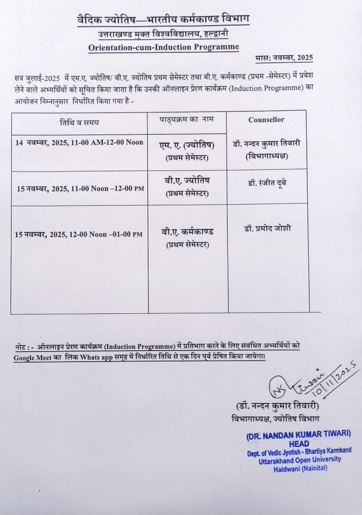 Notice: Online Induction Programme for New enrolled learners (July-2025) of M.A & B.A in Jyotish and Karmkand