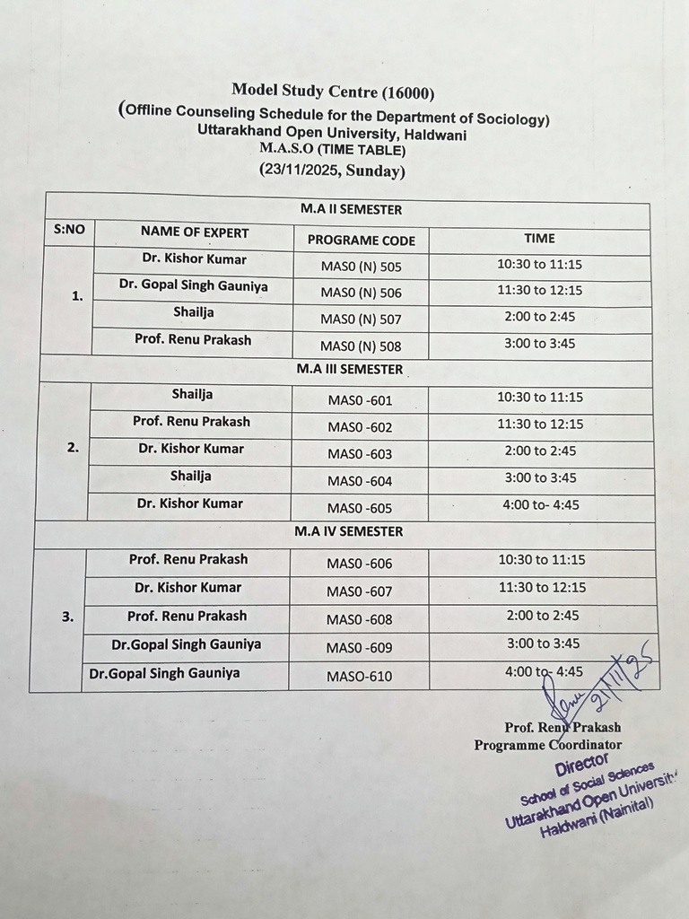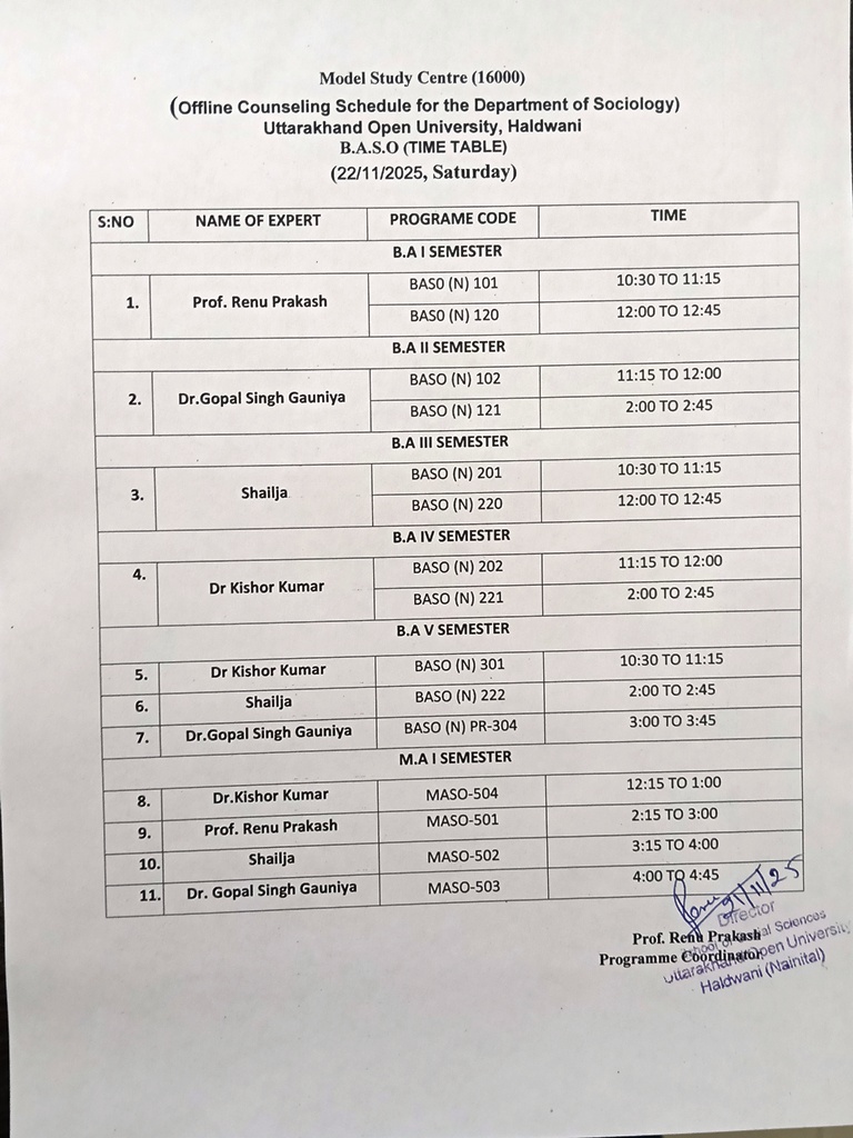 Notice:Counselling Schedule for Dept. of Sociology for Modal LSC Haldwani (LSC Code 16000)
