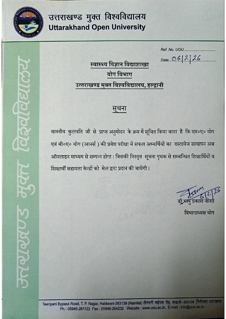 सूचना: एम.ए. योग एवं बी.ए. योग (ऑनर्स) प्रवेश परीक्षा 2025 : ऑनलाइन दस्तावेज सत्यापन संबंधी
