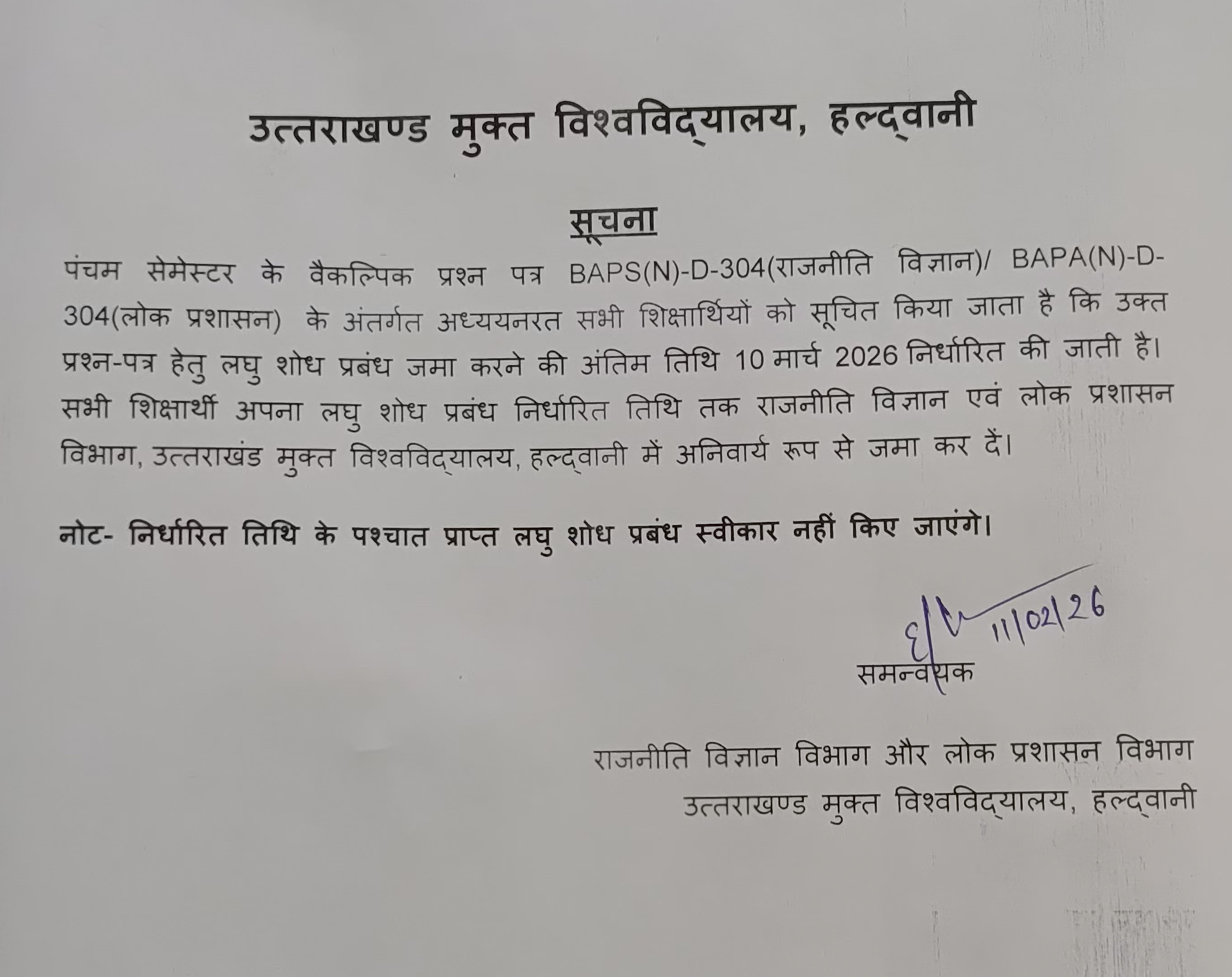 सूचना: BAPS(N)-D-304 (राजनीति विज्ञान) / BAPA(N)-D-304 ( लोक प्रशासन) पंचम सेमेस्टर के लघु शोध प्रबंध जमा कराने हेतु