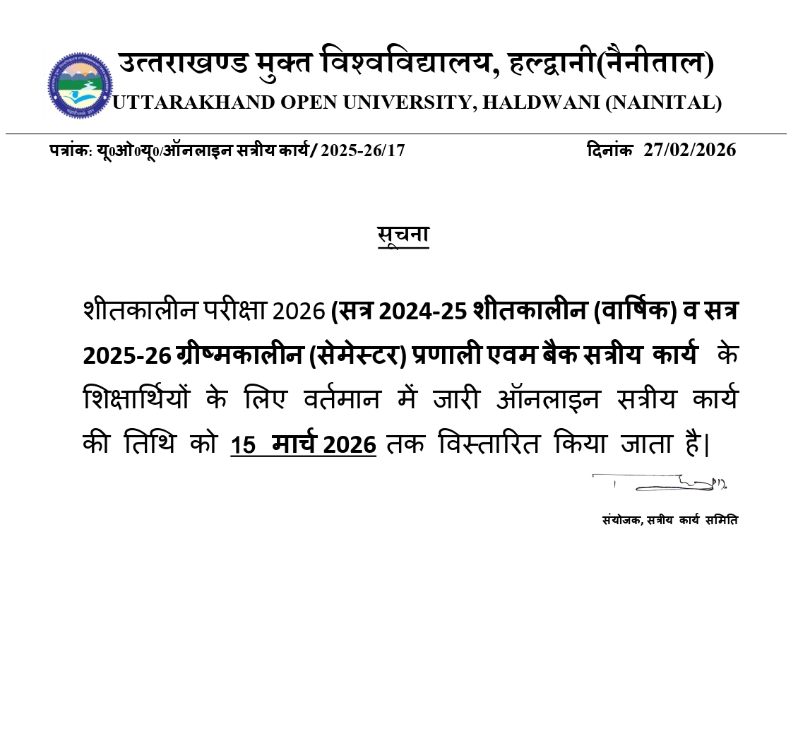 सूचना: ऑनलाइन सत्रीय कार्य जमा करने की अंतिम तिथि 15 मार्च 2026 तक विस्तारित