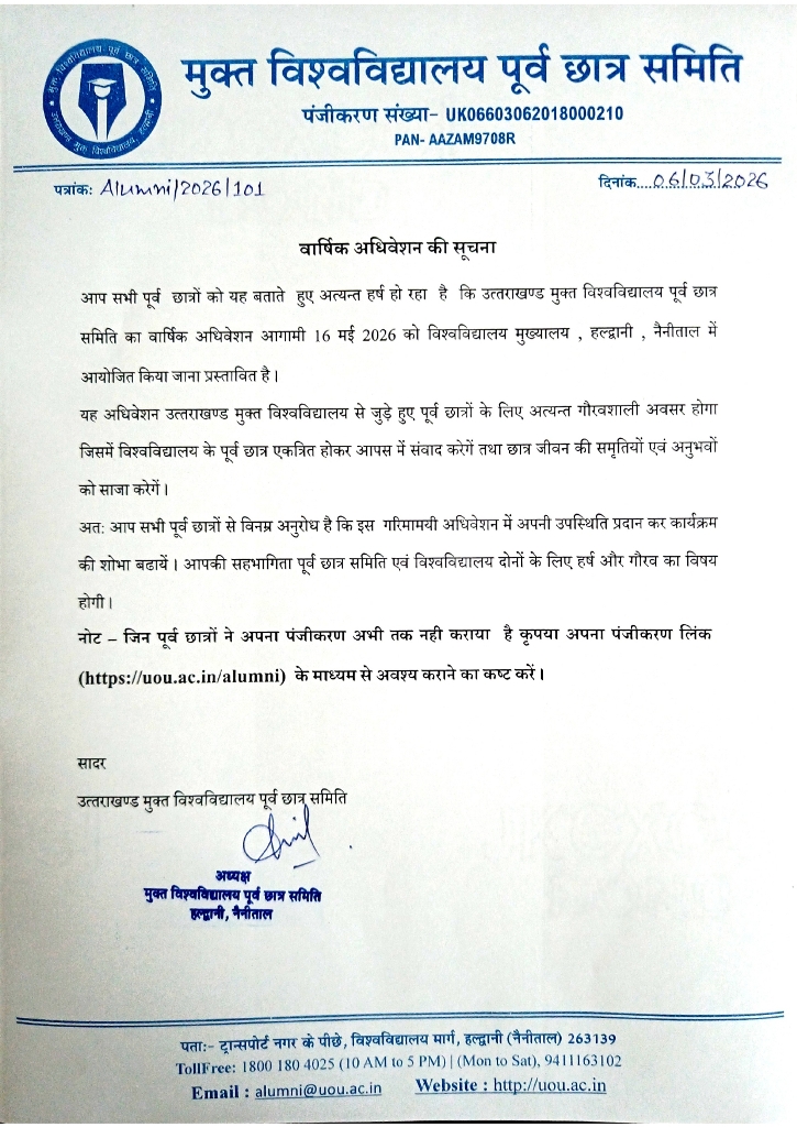 सूचना: उत्तराखंड मुक्त विश्वविद्यालय पूर्व छात्र समिति (Alumni) के वार्षिक अधिवेशन