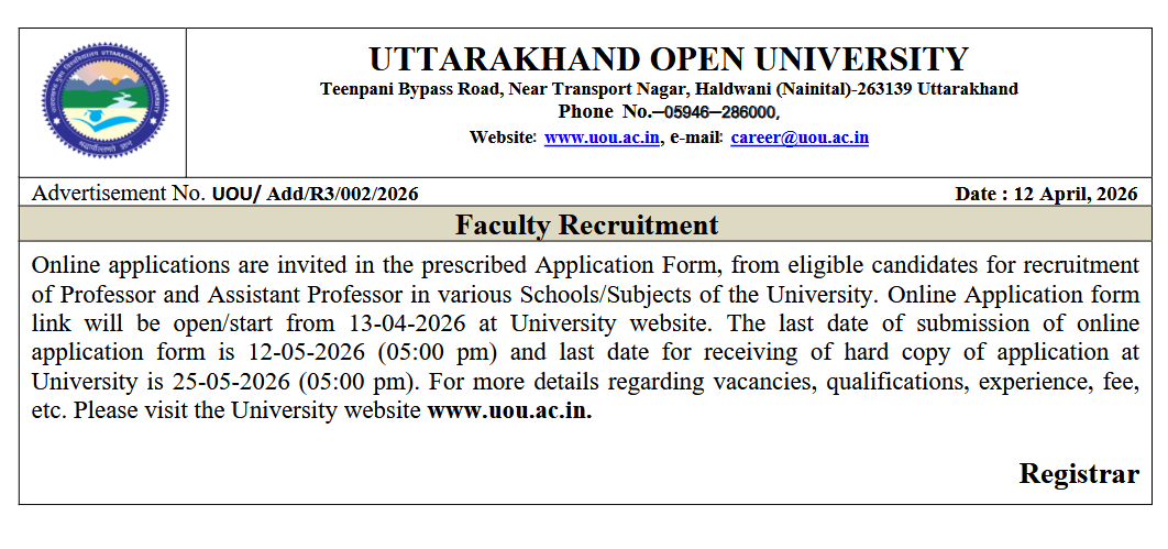 Attachment Size Detailed Advertisement for Professor and Asst. Professor (2.81 MB) 2.81 MB Eligibility Criteria for Professor and Asst. Professor (1.53 MB) 1.53 MB Date 2026-04-12 latest Career Language English