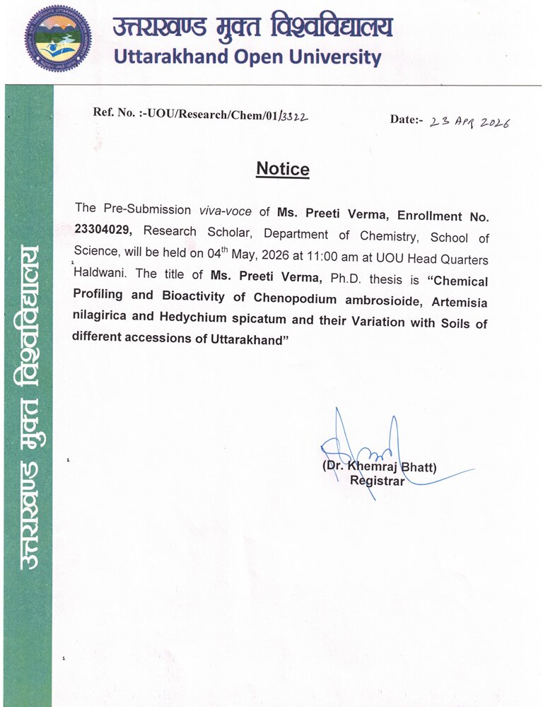 - सूचना : दिनॉक 16 मार्च 2026 (सोमवार) को ऑनलाइन माध्यम से आयोजित की जाने वाली एम0ए0 योग/बी0ए0 योग (ऑनर्स) की प्रवेश परीक्षा तिथि के संबध मेें।