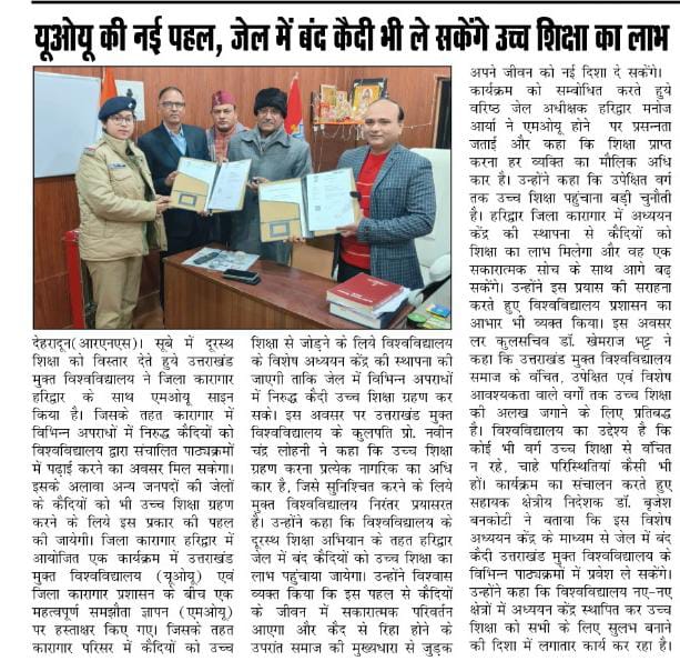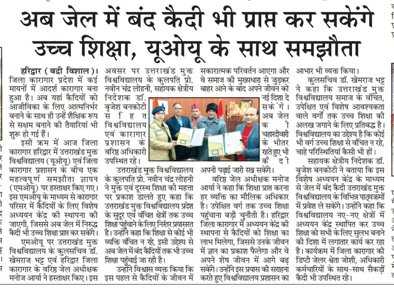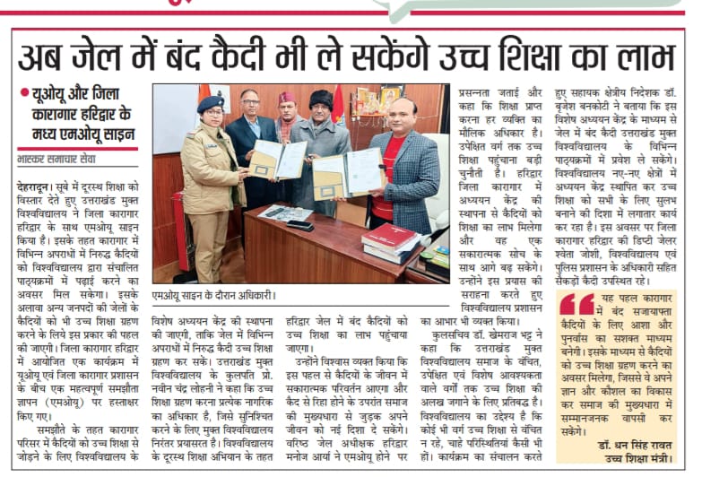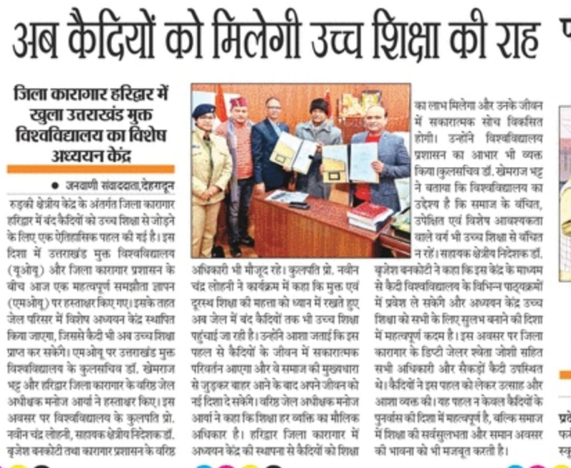 प्रेस विज्ञप्ति: जिला कारागार हरिद्वार में खुला उत्तराखंड मुक्त विश्वविद्यालय का विशेष अध्ययन केंद्र।