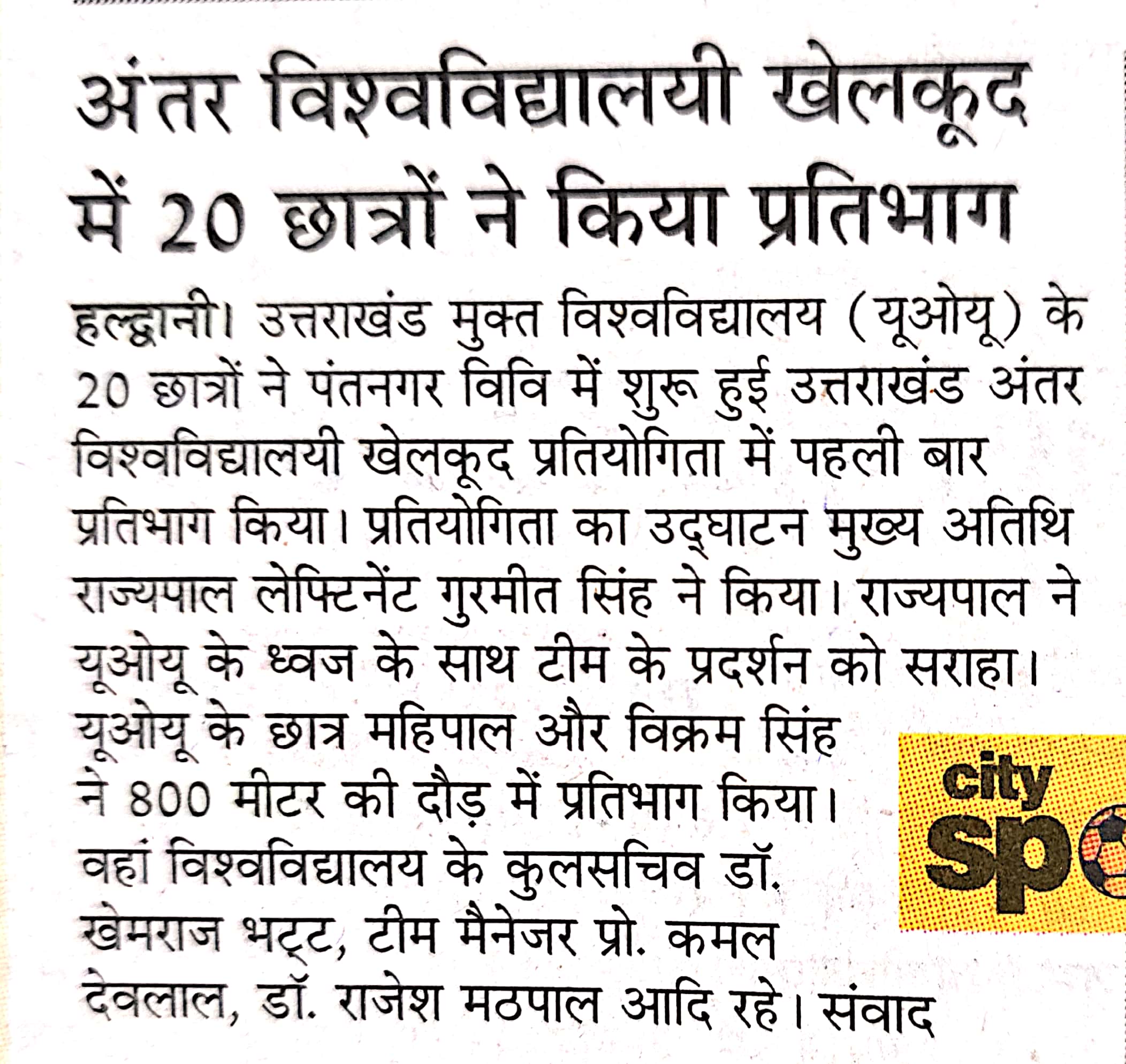 प्रेस विज्ञप्ति: यूओयू के 20 छात्रों ने पंतनगर विश्वविद्यालय में उत्तराखंड अंतर विश्वविद्यालयी खेलकूद प्रतियोगिता में प्रतिभाग किया। / February 24, 2026 Submitted by pawankumar on February 24, 2026 प्रेस विज्ञप्ति: यूओयू के 20 छात्रों ने पंतनगर विश्वविद्यालय में उत्तराखंड अंतर विश्वविद्यालयी खेलकूद प्रतियोगिता में प्रतिभाग किया। Log in to post comments