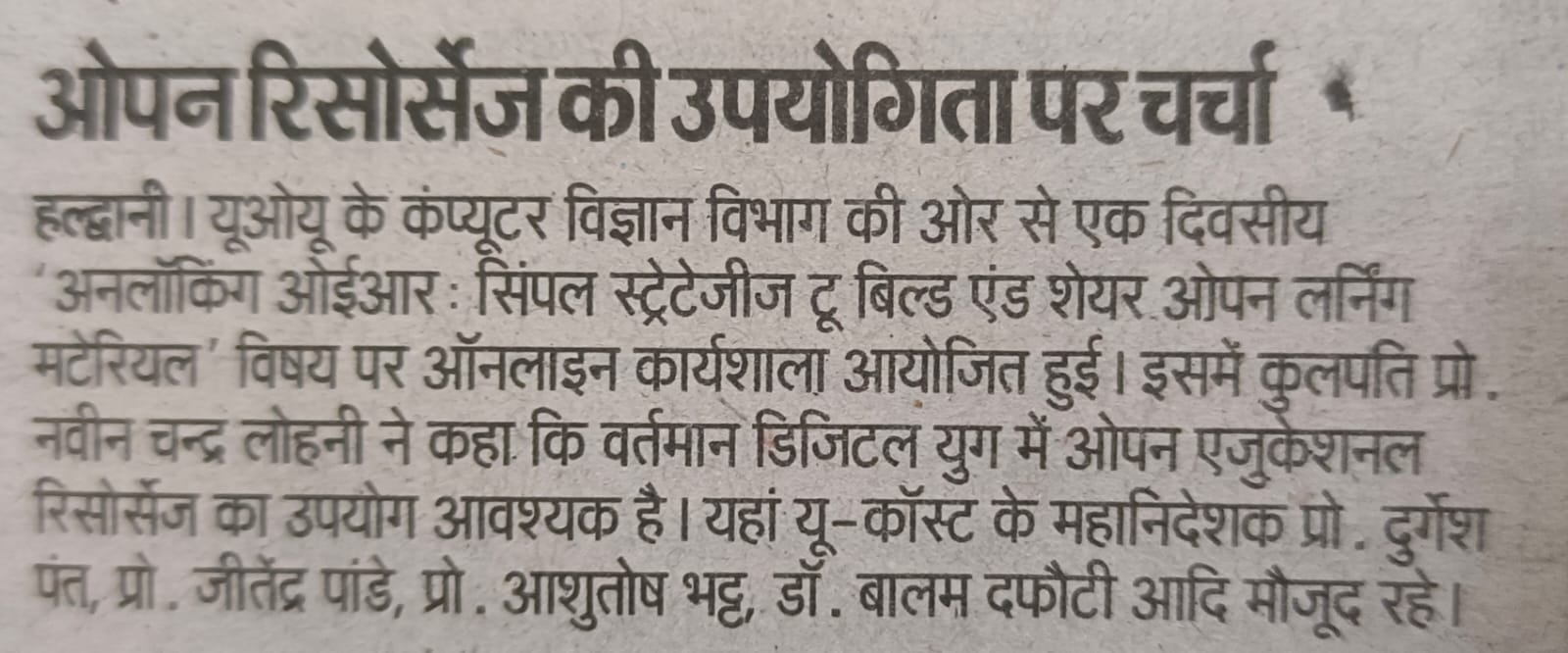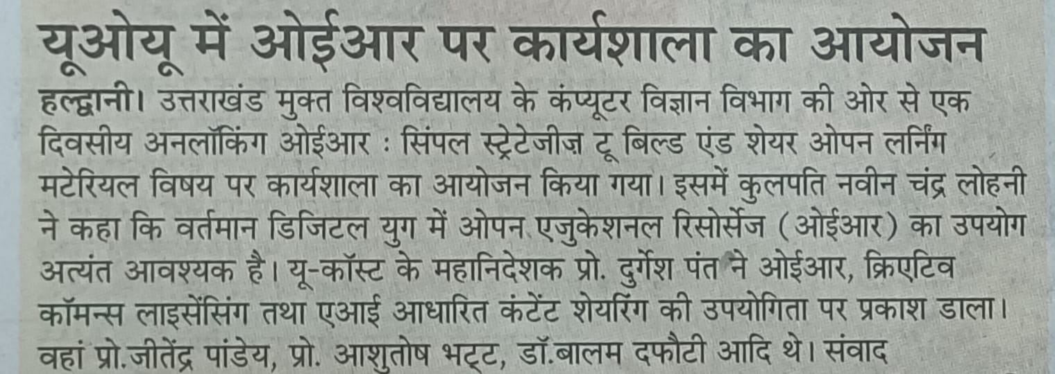 प्रेस विज्ञप्ति: यूओयू में ओईआर पर कार्यशाला का आयोजन। साभार हिंदुस्तान, अमर उजाला