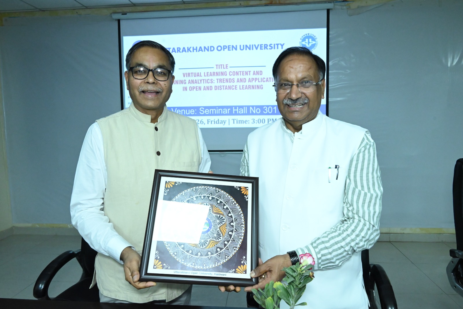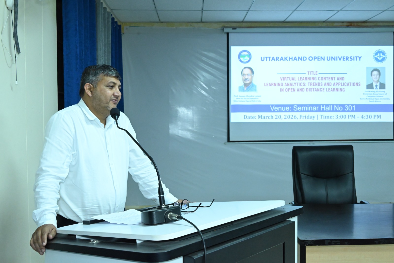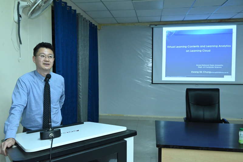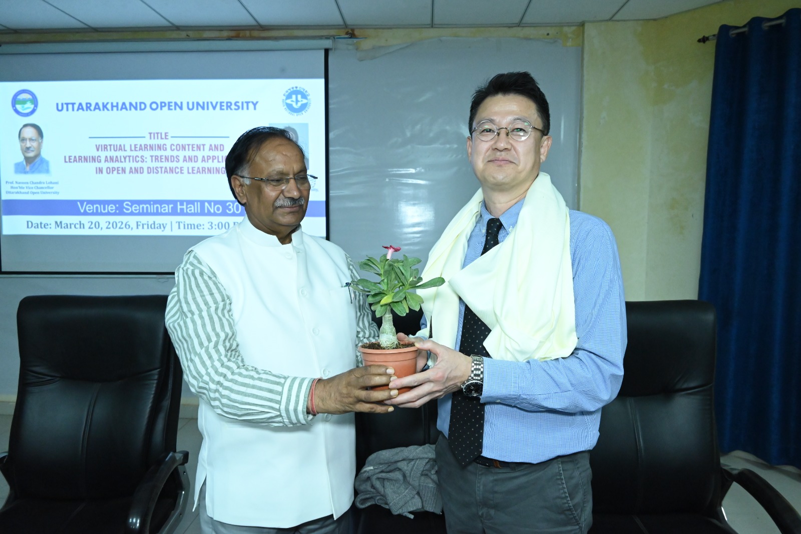 उत्तराखंड मुक्त विश्वविद्यालय, हल्द्वानी द्वारा अंतरराष्ट्रीय शैक्षणिक सहयोग को सुदृढ़ करने की दिशा में एक महत्वपूर्ण पहल के अंतर्गत कोरिया नेशनल ओपन यूनिवर्सिटी (KNOU), दक्षिण कोरिया के प्रतिष्ठित प्रोफेसर प्रो. क्वांग सिक चुंग के Visiting Professor Fellowship Programme के अंतर्गत आयोजित शैक्षणिक कार्यक्रम आज दिनांक 20 मार्च 2026 को सफलतापूर्वक सम्पन्न हुए। आज आयोजित कार्यक्रमों की श्रृंखला में प्रातः 11:00 बजे विश्वविद्यालय अतिथि गृह स्थित सेमिनार हॉल में “Institutional Overview and Academic Practices at KNOU: A Perspective from Open and Distance Learning” विषय पर परिचयात्मक संगोष्ठी आयोजित की गई, जिसमें प्रो. चुंग ने KNOU की शैक्षणिक संरचना, ओपन एंड डिस्टेंस लर्निंग प्रणाली तथा नवाचार आधारित शिक्षण पद्धतियों पर विस्तार से प्रकाश डाला। इसके उपरांत दोपहर 12:00 बजे “Interaction with Research and Innovation Cell” सत्र आयोजित हुआ, जिसमें “Overview of Research Activities at UOU and Interactive Discussion” विषय पर विश्वविद्यालय के शोध कार्यों पर चर्चा की गई तथा शोधार्थियों एवं शिक्षकों के साथ सार्थक संवाद स्थापित हुआ। दोपहर 3:00 बजे से सेमिनार हॉल संख्या 301 में आयोजित मुख्य व्याख्यान में प्रो. चुंग ने “Virtual Learning Content and Learning Analytics: Trends and Applications in Open and Distance Learning” विषय पर व्याख्यान देते हुए डिजिटल शिक्षा, लर्निंग एनालिटिक्स, गेम-आधारित शिक्षण तथा क्लाउड-आधारित शिक्षण प्रणालियों के वर्तमान रुझानों एवं भविष्य की संभावनाओं पर विस्तृत चर्चा की। उन्होंने डेटा-आधारित शिक्षण सुधार की आवश्यकता पर विशेष बल दिया। इस अवसर पर विश्वविद्यालय के कुलपति प्रो. नवीन चंद्र लोहानी ने कहा कि Visiting Professor Fellowship Programme के माध्यम से विश्वविद्यालय वैश्विक शैक्षणिक सहयोग की दिशा में सशक्त कदम उठा रहा है। उन्होंने कहा कि ऐसे कार्यक्रम शिक्षकों एवं विद्यार्थियों को अंतरराष्ट्रीय स्तर की शैक्षणिक समझ प्रदान करते हैं तथा शोध एवं नवाचार को नई दिशा देते हैं। अंतरराष्ट्रीय संबंध प्रकोष्ठ के प्रभारी प्रो. जितेन्द्र पांडे ने बताया कि इस प्रकार की शैक्षणिक गतिविधियाँ विश्वविद्यालय के अंतरराष्ट्रीयकरण के प्रयासों को गति प्रदान करती हैं। उन्होंने कहा कि इस सहयोग के माध्यम से संयुक्त शोध, सह-विकसित पाठ्यक्रम, MOOCs तथा प्रौद्योगिकी-आधारित शिक्षण नवाचारों पर ठोस कार्य किया जा रहा है। कार्यक्रमों में विश्वविद्यालय के शिक्षक, शोधार्थी एवं अधिकारीगण उत्साहपूर्वक उपस्थित रहे तथा संवादात्मक सत्रों में सक्रिय सहभागिता की। उल्लेखनीय है कि प्रो. क्वांग सिक चुंग 18 मार्च से 30 मार्च 2026 तक विश्वविद्यालय में प्रवास पर हैं तथा इस अवधि में विभिन्न शैक्षणिक एवं शोध गतिविधियों में सहभागिता कर रहे हैं। निकट भविष्य में उत्तराखंड मुक्त विश्वविद्यालय एवं कोरिया नेशनल ओपन यूनिवर्सिटी (KNOU) के मध्य औपचा
