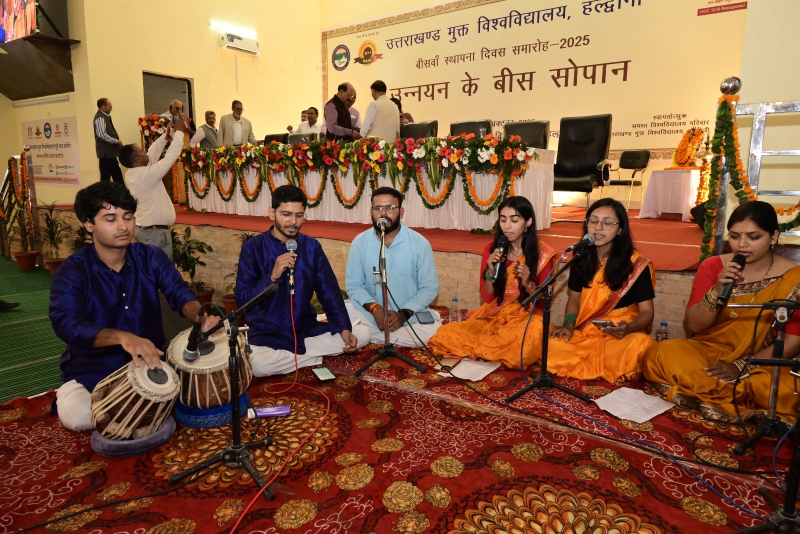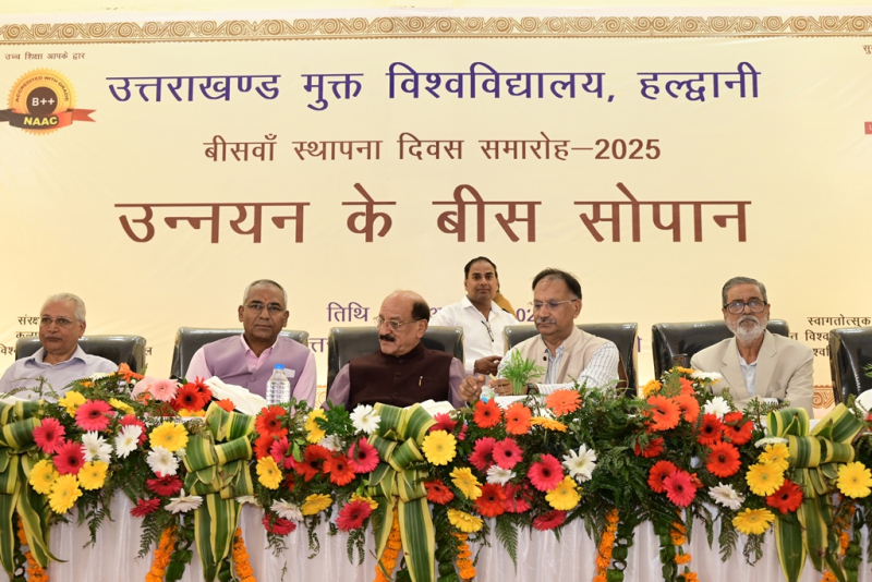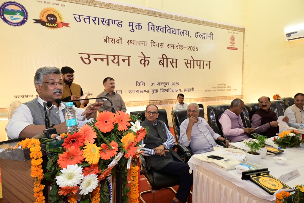 विश्वविद्यालय के सभागार में आयोजित स्थापना दिवस के कार्यक्रम में बोलते हुए काबीना मंत्री श्री उनियाल ने कहा कि विश्वविद्यालय ने अपने 20 सालों में दूरस्थ्य शिक्षा के क्षेत्र में उल्लेखनीय प्रगति की है। उन्होंने आशा व्यक्त की प्रगति की यह रफ्तार आगे भी जारी रहेगी। उन्होंने कहा कि मानव अपने मस्तिष्क का उचित उपयोग करके बेहतर परिणाम ला सकता है और दुनिया में नाम कर सकता है, हमें भी इसका अनुसरण करना चाहिए। उन्होंने भाषा साहित्य पर चर्चा करते हुए कहा कि साहित्य को आगे बढ़ाने के लिए साहित्यकारों का सम्मान भी किया जाना आवश्यक है। उत्तराखण्ड सरकार ने साहित्यकारों का सम्मान कर विशेष पहल की है। कार्यक्रम में क्षेत्रीय विधायक डा. मोहन सिंह बिष्ट ने कहा कि आज दूरस्थ्य शिक्षा प्रदेश के दूरदराज के क्षेत्रों में भी सुगमता से पहुंच रही है। इसमें उत्तराखण्ड मुक्त विश्वविद्यालय का बहुत सराहनीय प्रयास रहा है। उन्होंने 20 वर्ष की सफलता पर विश्वविद्यालय के समस्त लोगों को बधाई दी। जबकि कार्यक्रम की अध्यक्षता करते हुए कुलपति प्रो. नवीन चन्द्र लोहनी ने सभी आगन्तुकों का आभार प्रकट करते हुए बताया कि विश्वविद्यालय आगामी सत्र से होमस्टे पर रोजगारपरक पाठ्यक्रम संचालित करने जा रहा है। इसके अलावा हम शीघ्र ही कौशल विकास के नये पाठ्यक्रम भी शुरू करेंगे, जिससे कि यहां के लोगों के लिए रोजगार के नये अवसर पैदा हो सकें। कुलपति ने यह भी बताया कि विश्वविद्यालय भारतीय ज्ञान परंपरा का पाठ्यक्रम भी ला रहा है, जो कि इस कार्य को करने वाला उत्तराखण्ड का पहला विश्वविद्यालय होगा।