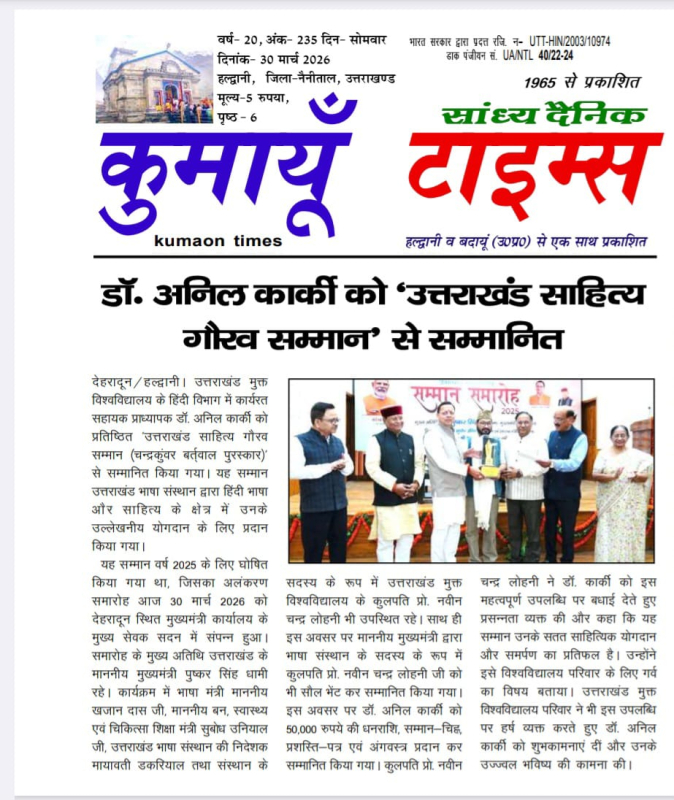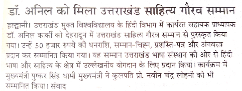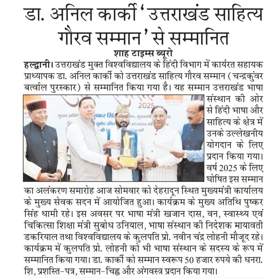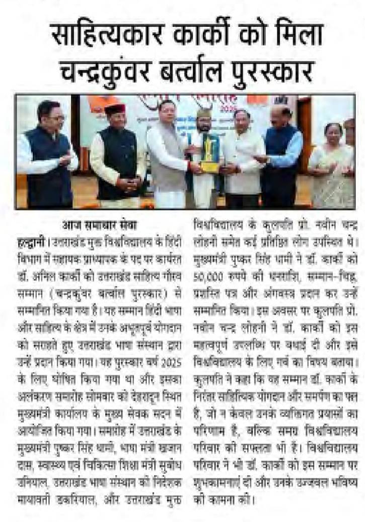 देहरादून/हल्द्वानी। उत्तराखंड मुक्त विश्वविद्यालय के हिंदी विभाग में कार्यरत सहायक प्राध्यापक डॉ. अनिल कार्की को प्रतिष्ठित ‘उत्तराखंड साहित्य गौरव सम्मान (चन्द्रकुंवर बर्त्वाल पुरस्कार)’ से सम्मानित किया गया। यह सम्मान उत्तराखंड भाषा संस्थान द्वारा हिंदी भाषा और साहित्य के क्षेत्र में उनके उल्लेखनीय योगदान के लिए प्रदान किया गया।