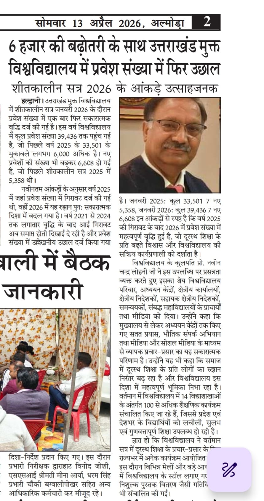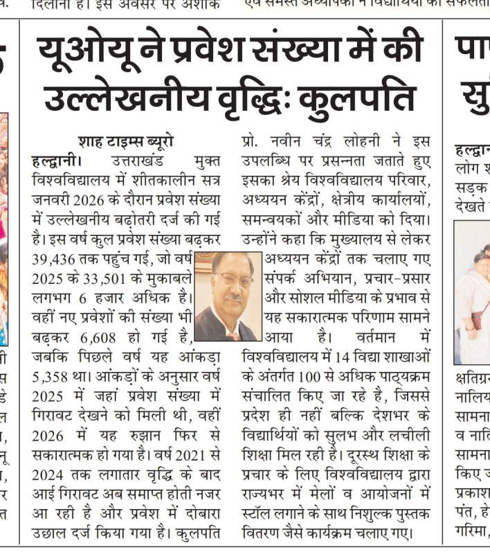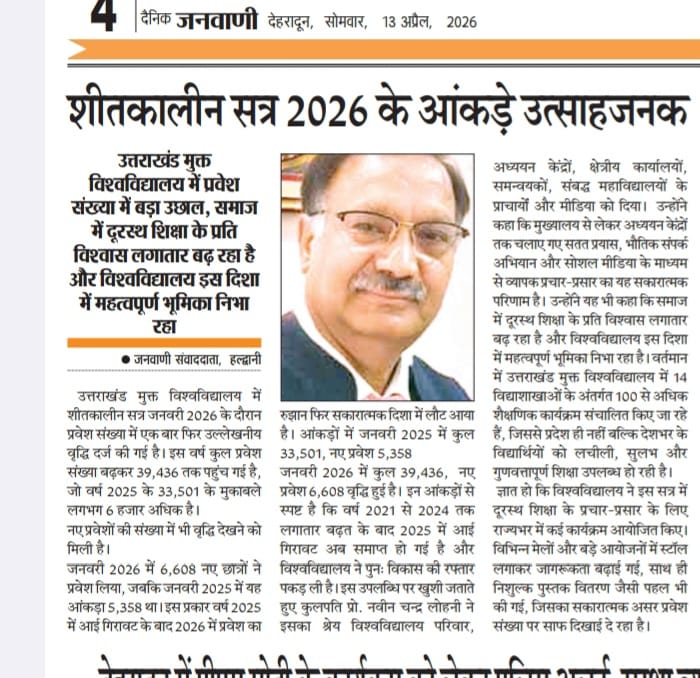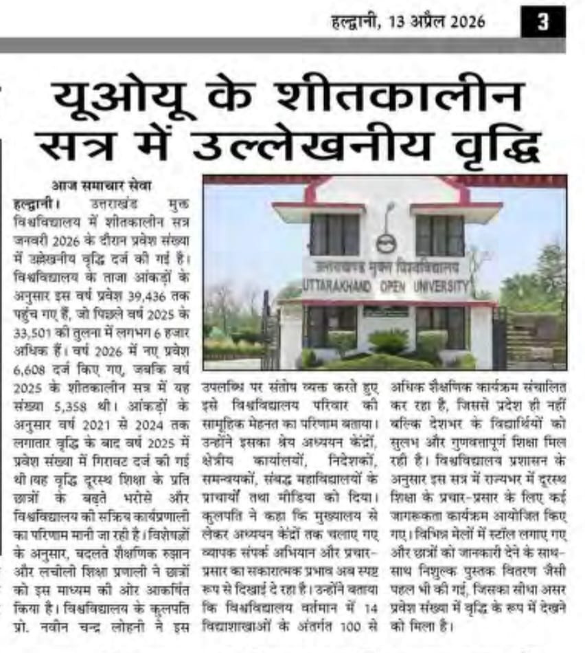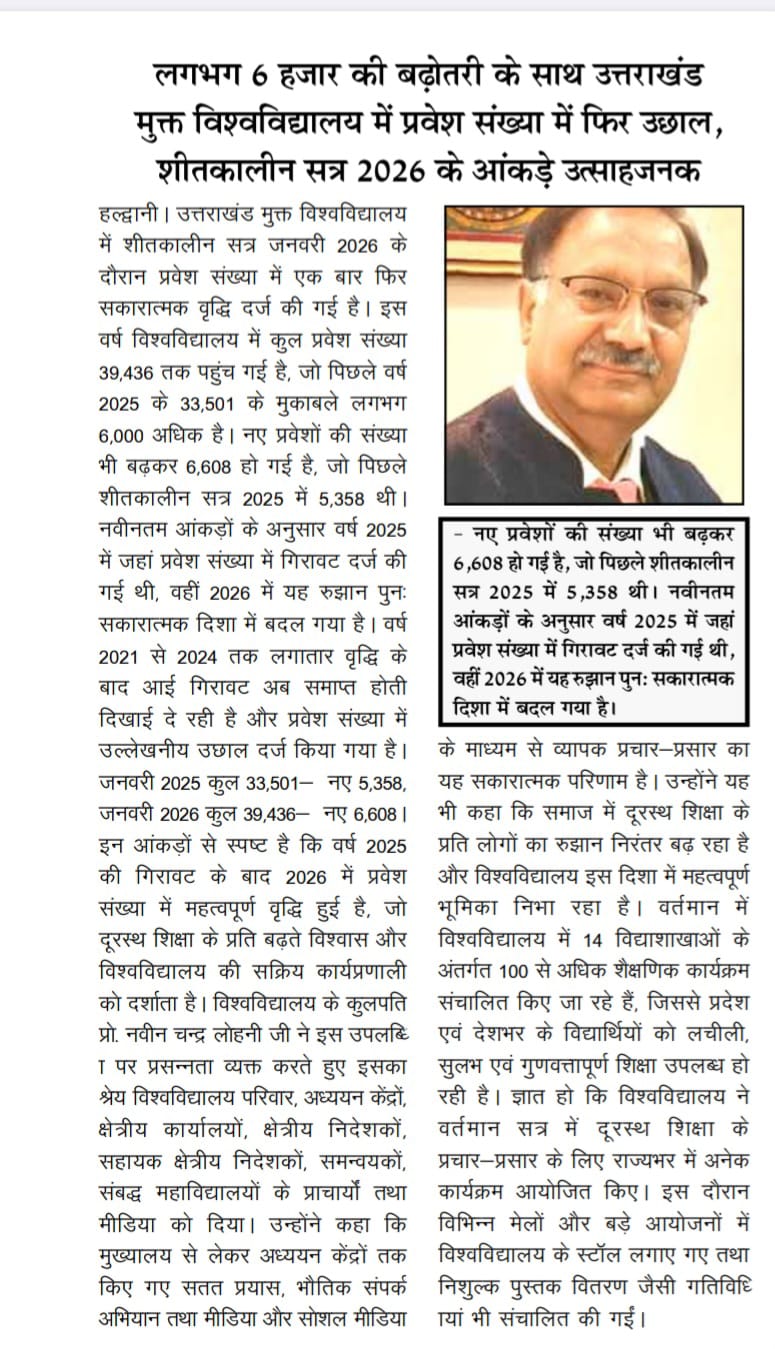 लगभग 6 हजार की बढ़ोतरी के साथ उत्तराखंड मुक्त विश्वविद्यालय में प्रवेश संख्या में फिर उछाल, शीतकालीन सत्र 2026 के आंकड़े उत्साहजनक