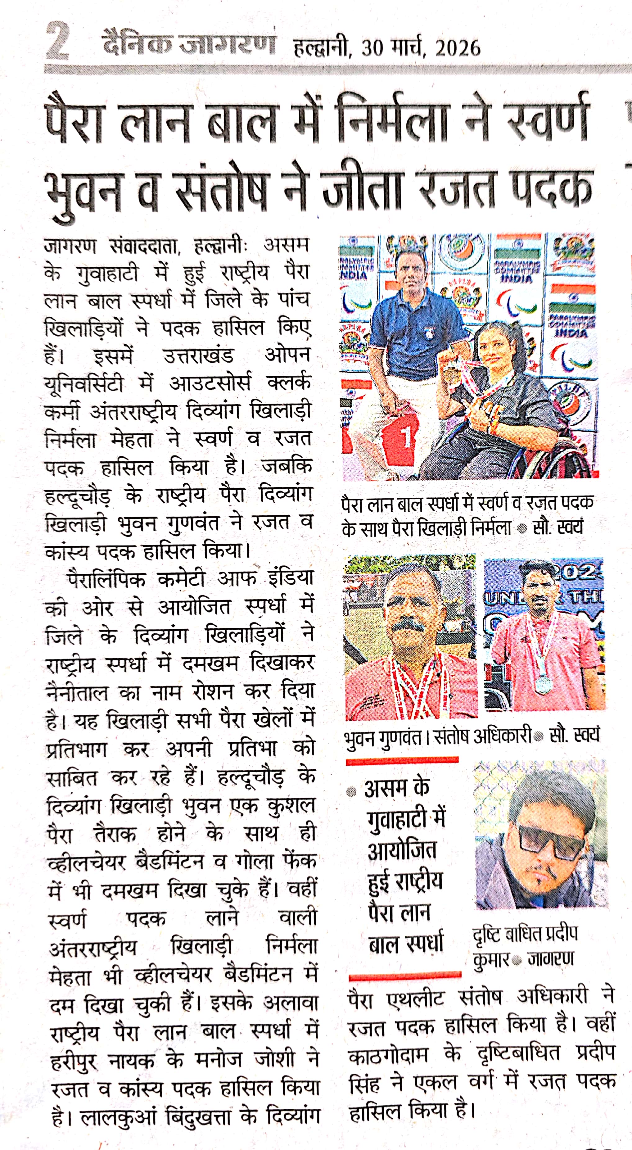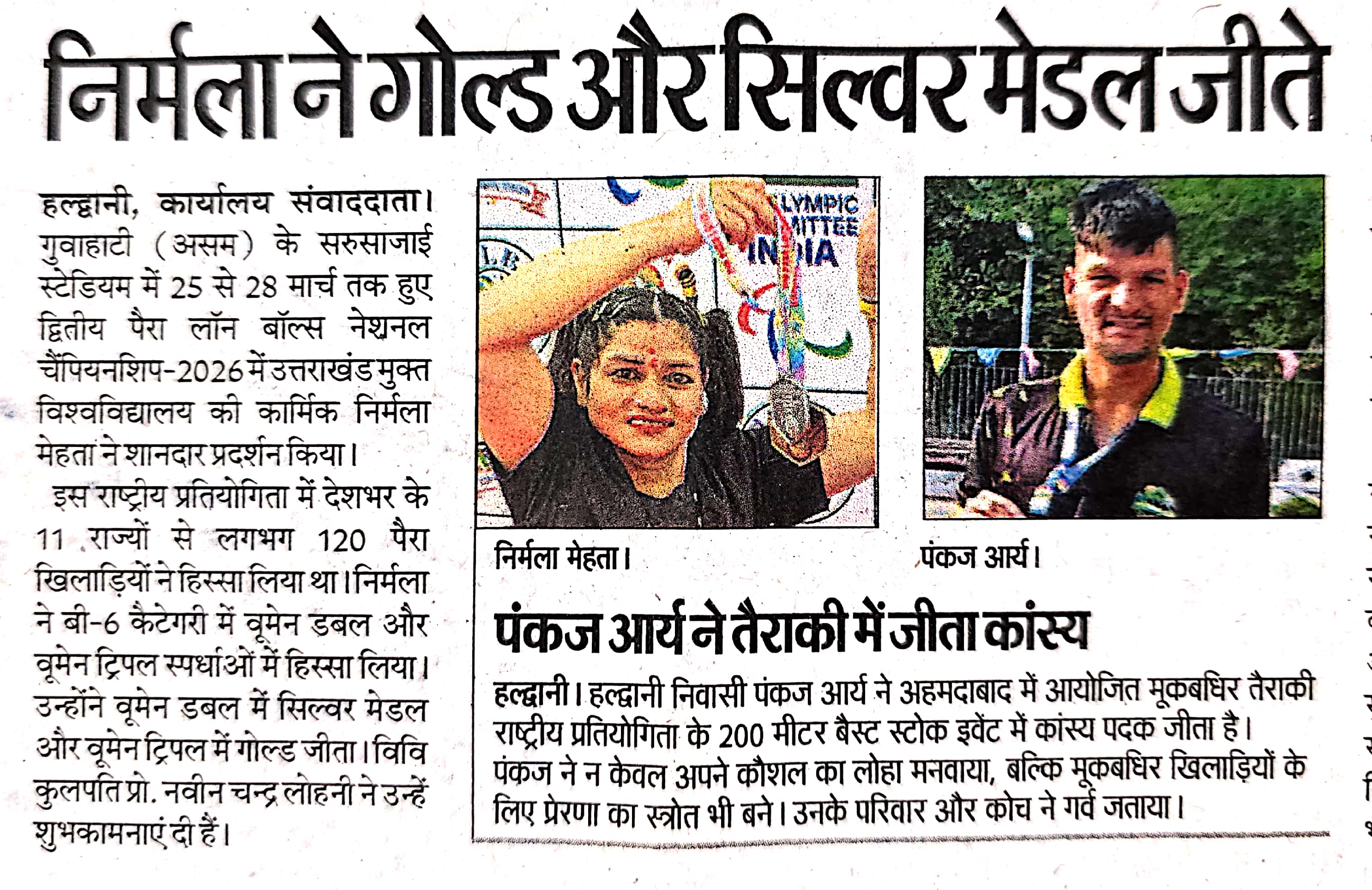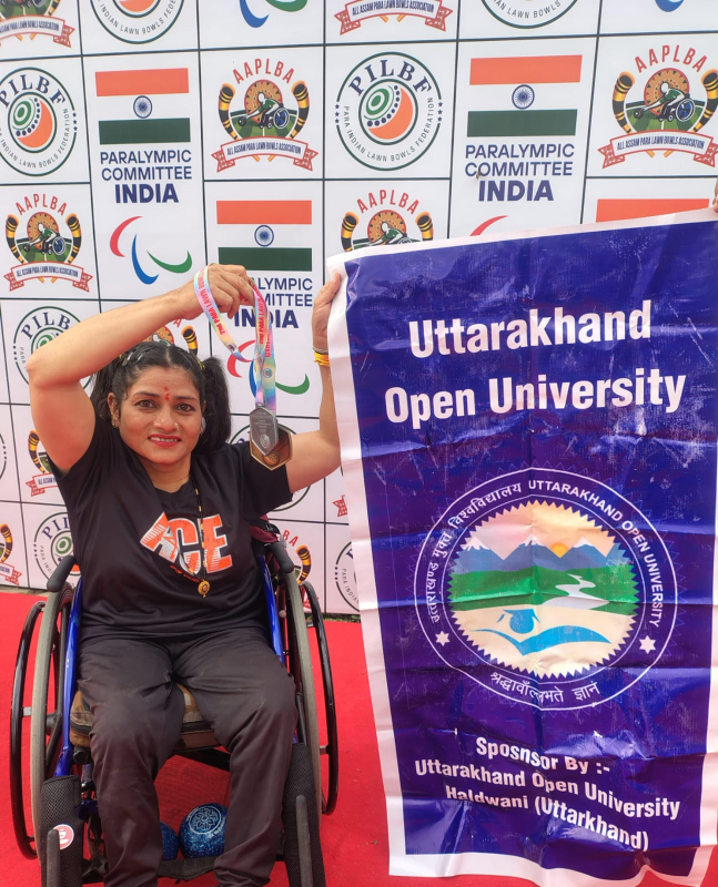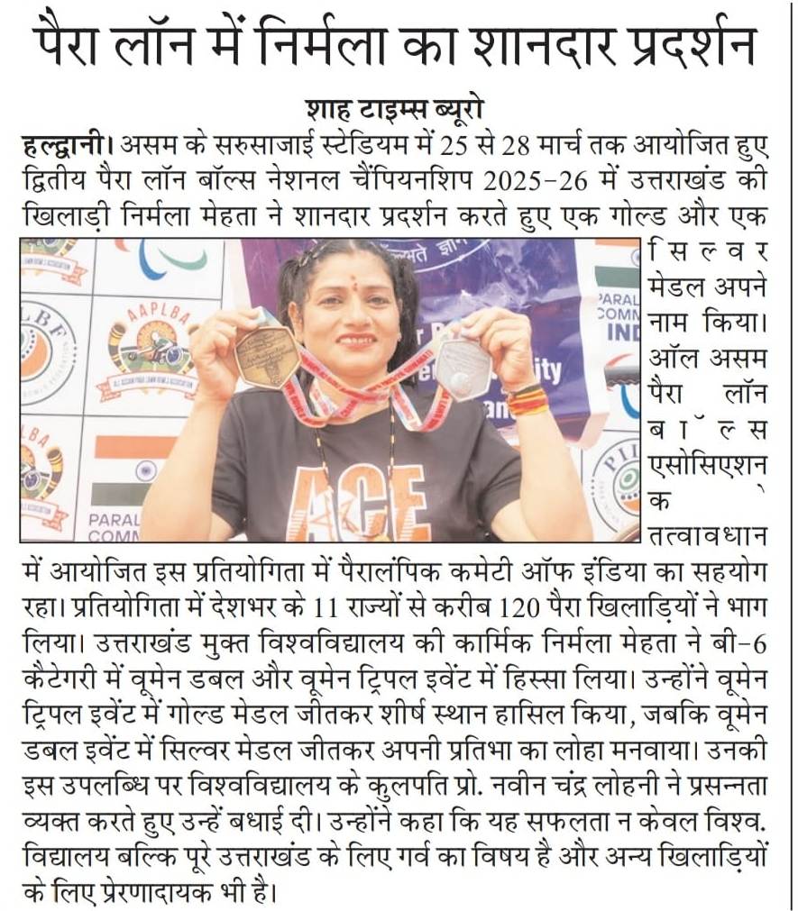 यूओयू कर्मी निर्मला मेहता ने पैरा लॉन बॉल में जीता गोल्ड मैडल गुवाहाटी में आयोजित द्वितीय पैरा लॉन बॉल्स नेशनल चैंपियनशिप में निर्मला मेहता ने जीते गोल्ड व सिल्वर, माननीय कुलपति जी ने दी बधाई गुवाहाटी (असम): सरुसाजाई स्टेडियम, गुवाहाटी में 25 से 28 मार्च 2026 तक आयोजित द्वितीय पैरा लॉन बॉल्स नेशनल चैंपियनशिप 2025-26 का सफल आयोजन हुआ। ऑल असम पैरा लॉन बॉल्स एसोसिएशन द्वारा आयोजित इस प्रतियोगिता में पैरालंपिक कमेटी ऑफ इंडिया का सहयोग रहा। इस राष्ट्रीय प्रतियोगिता में देश के 11 राज्यों से लगभग 120 पैरा खिलाड़ियों ने प्रतिभाग किया। प्रतियोगिता के नियमों के अनुसार प्रत्येक खिलाड़ी अधिकतम दो इवेंट्स में ही भाग ले सकता था। इस प्रतिष्ठित प्रतियोगिता में उत्तराखंड मुक्त विश्वविद्यालय की कार्मिक निर्मला मेहता ने शानदार प्रदर्शन करते हुए B6 कैटेगरी में वूमेन डबल एवं वूमेन ट्रिपल इवेंट्स में प्रतिभाग किया। उन्होंने वूमेन डबल में सिल्वर मेडल तथा वूमेन ट्रिपल में गोल्ड मेडल जीतकर उल्लेखनीय उपलब्धि हासिल की। निर्मला मेहता की इस सफलता पर उत्तराखंड मुक्त विश्वविद्यालय के कुलपति प्रो. नवीन चन्द्र लोहनी जी ने प्रसन्नता व्यक्त करते हुए उन्हें हार्दिक बधाई दी। उन्होंने कहा कि यह उपलब्धि विश्वविद्यालय के लिए गौरव का विषय है और अन्य खिलाड़ियों के लिए प्रेरणादायक है। निर्मला की इस उपलब्धि से न केवल विश्वविद्यालय, बल्कि पूरे उत्तराखंड का नाम राष्ट्रीय स्तर पर रोशन हुआ है।