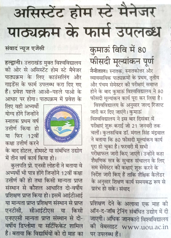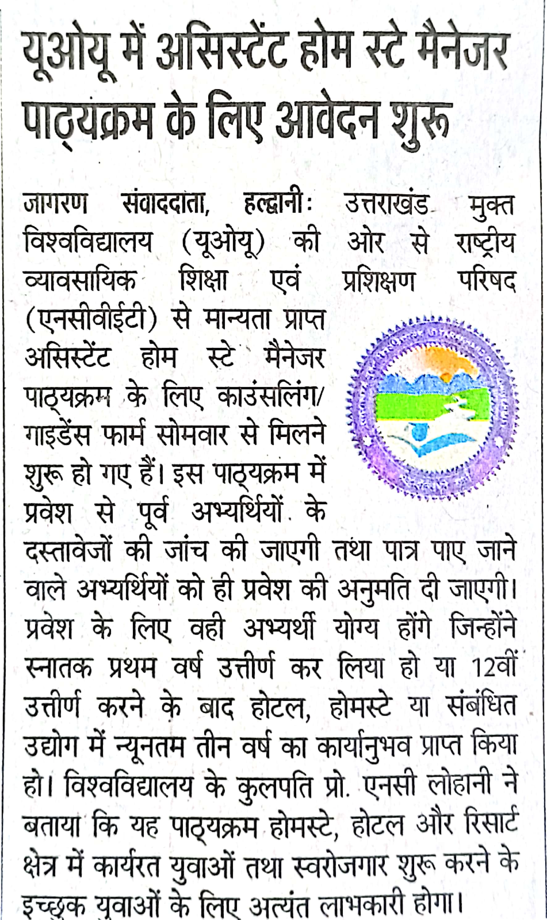 यूओयू में असिस्टेंट होम स्टे मैनेजर पाठ्यक्रम के लिए आवेदन शुरू