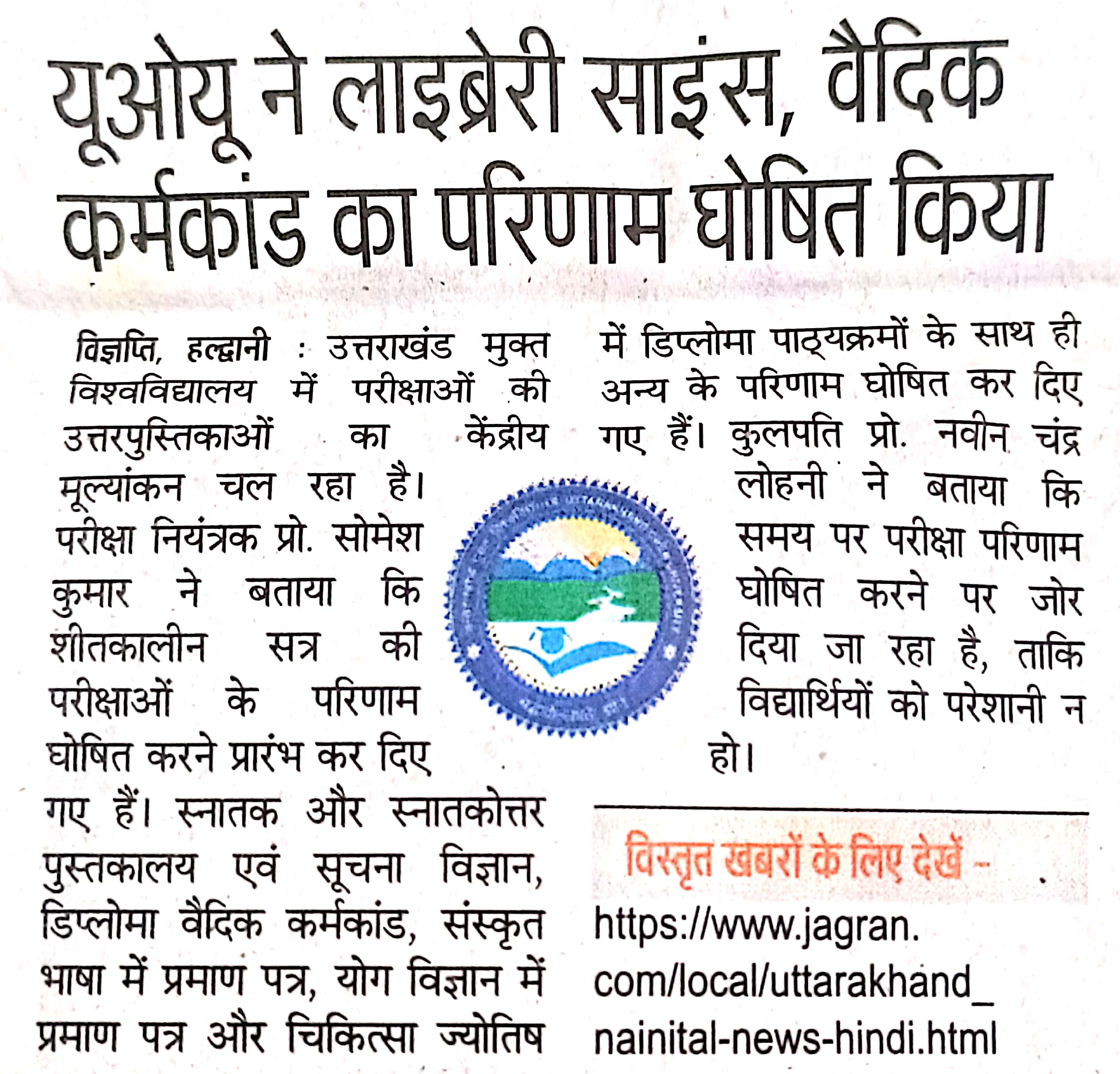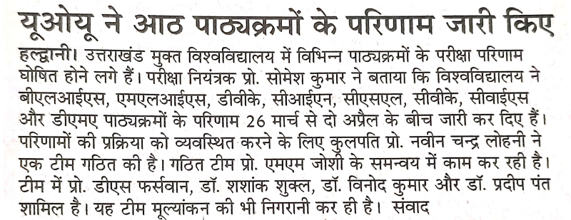 यूओयू ने आठ पाठ्यक्रमों के परिणाम जारी किए साभार दैनिक जागरण, अमर उजाला