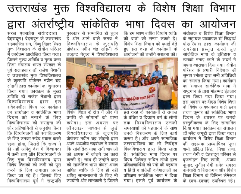 उत्तराखण्‍ड मुक्‍त विश्‍वविद्यालय ने मनाया अंतर्राष्‍ट्रीय सांकेतिक भाषा दिवस
